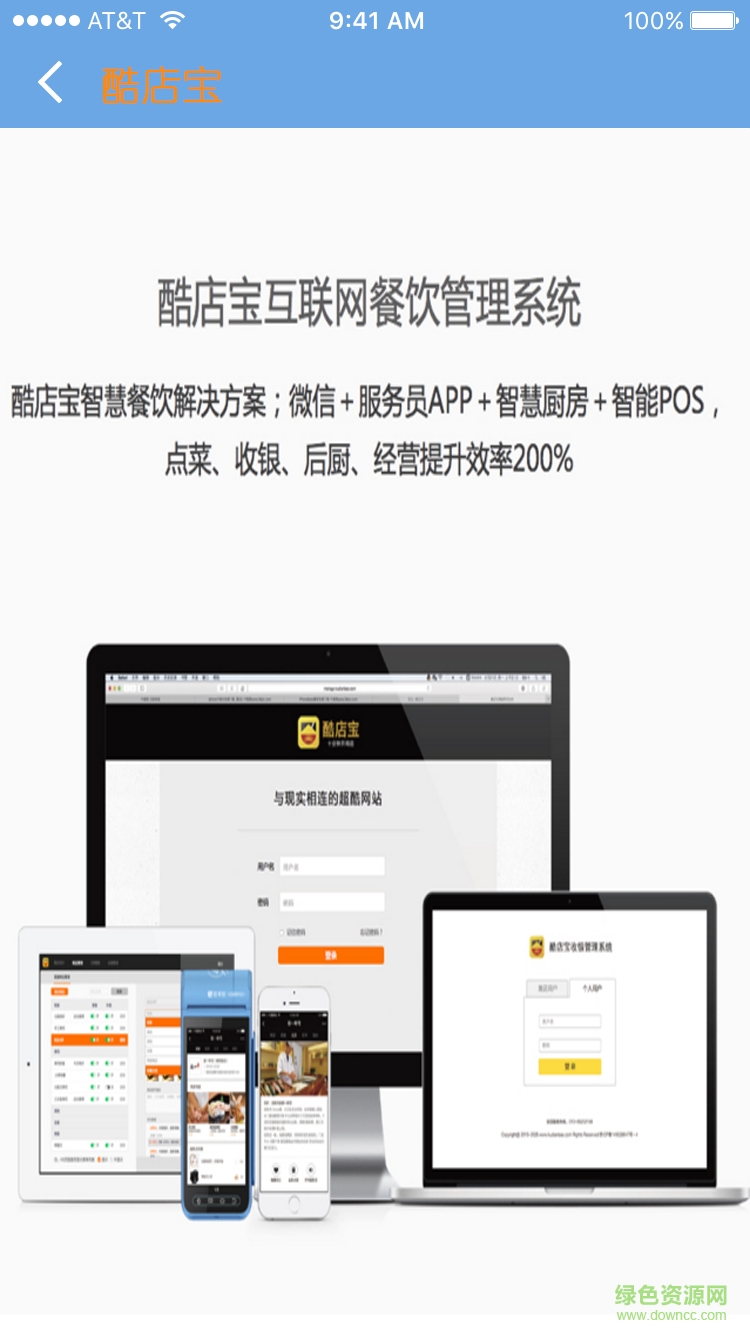 酷店宝推广客户端是一款专注于餐饮市场的智能管理应用,操作界面直观清爽,支持扫描二维码下单,具备强大的数据剖析,可以精确分配时间和职员!大大提升店铺管理效率,节省本钱,有需要者欢迎在绿色资源网下载用!