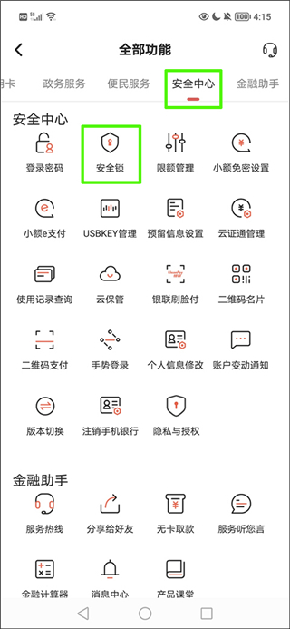 2、在全部功能界面的安全中心一栏找到并点击“安全锁”按钮选项;